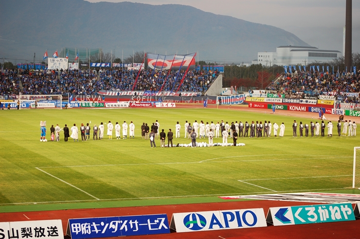 試合後は、解任が決定した甲府 大木監督のセレモニー。J1へ昇格させ、整備されていない環境でも、チームをここまで牽引し続けた指揮官。その「人柄ゆえに愛された監督」との別れを目の当たりにして、同じ境遇にあるアウェイ側からも惜しみない拍手が送られた。このチームなら、きっとまた昇格してくるはず。